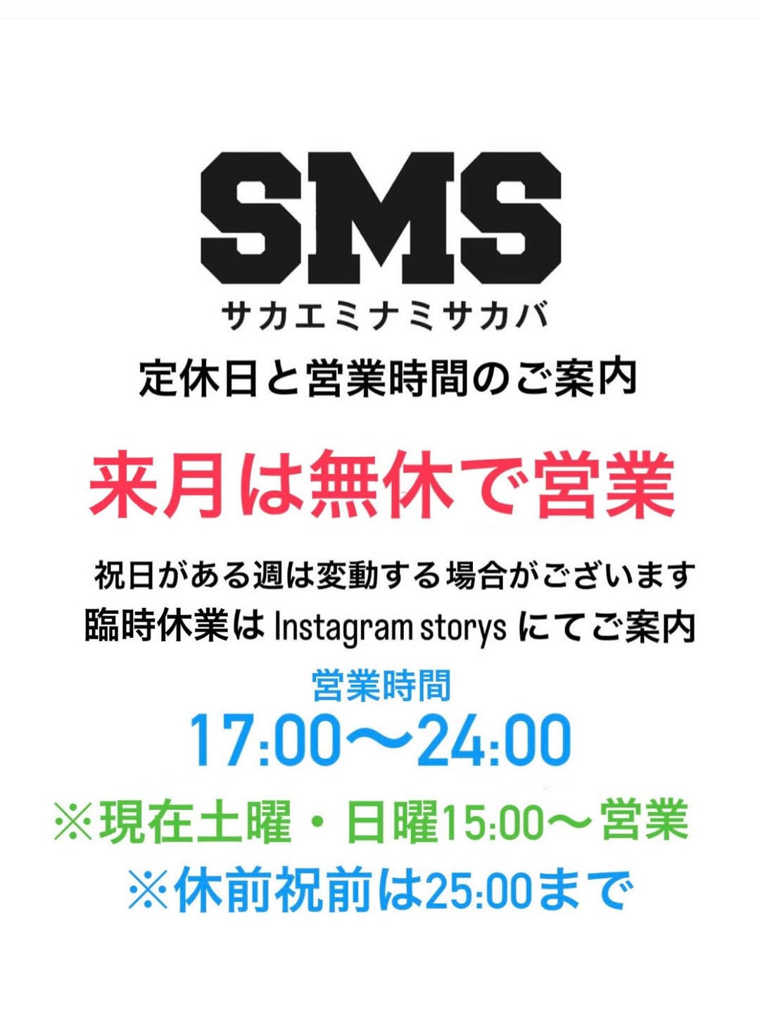 SMSサカエミナミサカバは現在水曜日も営業